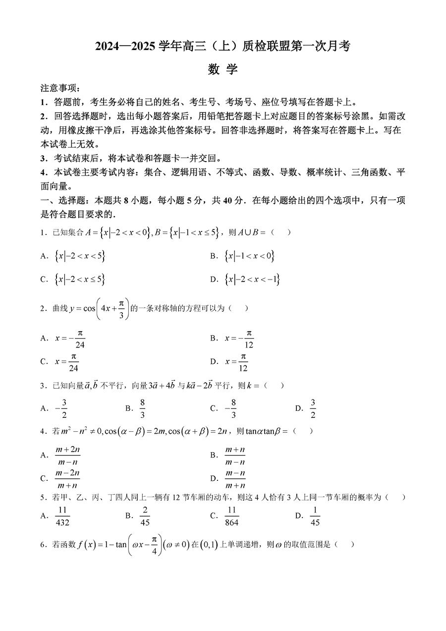 信阳一模2025届高三第一次教学质检数学试卷及参考答案