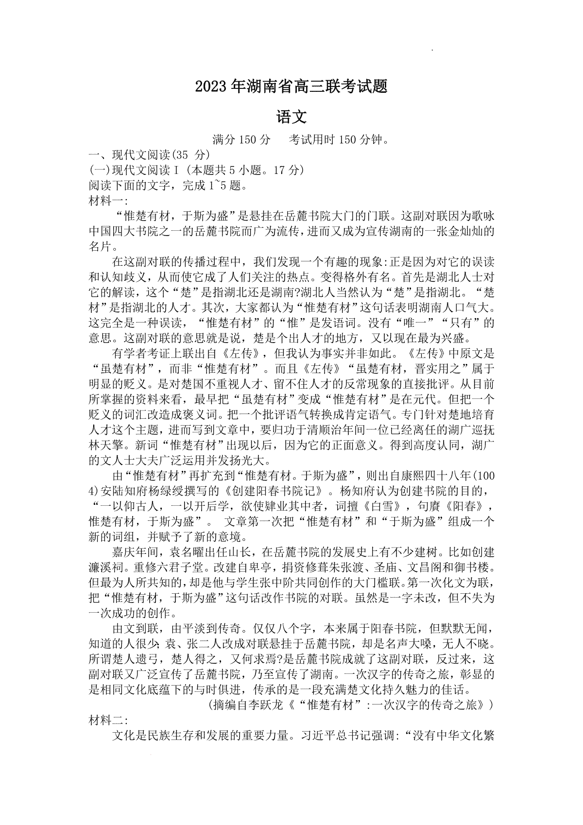 2023年湖南省高三联考语文