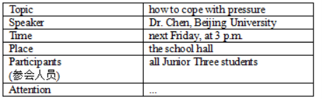 In order to help the students cope with pressure properly, our school will invite Dr. Chen from Peking University to give a lecture on in the school hall. Al the students of Junior Three are required to attend it. Dr. Chen will introduce some effective ways of dealing with pressure through some activities. It will last two hours from 5 p.m. to 7 p.m. on July 15th. Please take your notebook with you and keep quiet during the speech. After the speech, anyone with questions can communicate with the professor individually. Please get your questions ready.