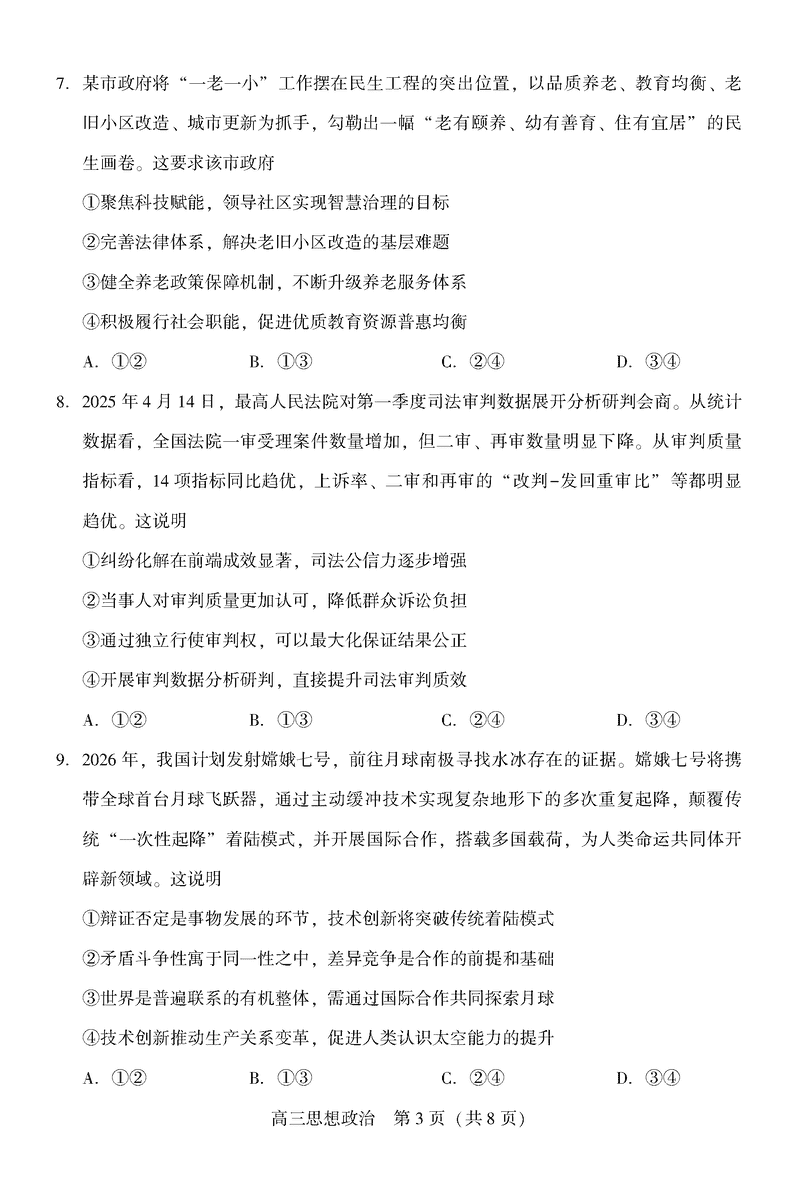 导读沈阳市2025届高三下教学质量监测(三)政治试题质量较高,题型多样,将作为考察考生对相应考点的掌握程度,考后将及时整理试题及答案解析相关信息,以供考生学习交流!政治试题及答案解析