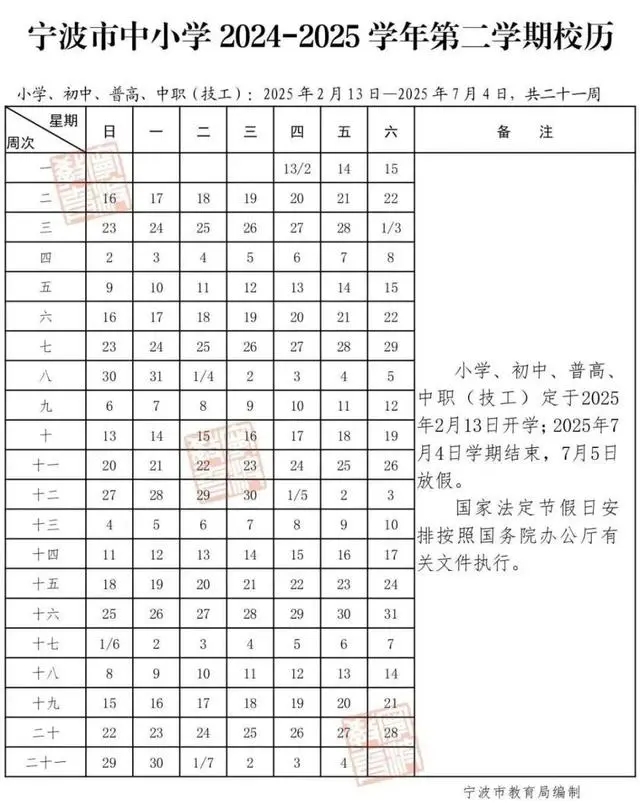 2025宁波市中小学寒假放假时间公布,小学、初中、普高、中职(技工)定于2025年1月21日学期结束,1月22日放假。小学、初中、普高、中职(技工)定于2025年2月13日开学。