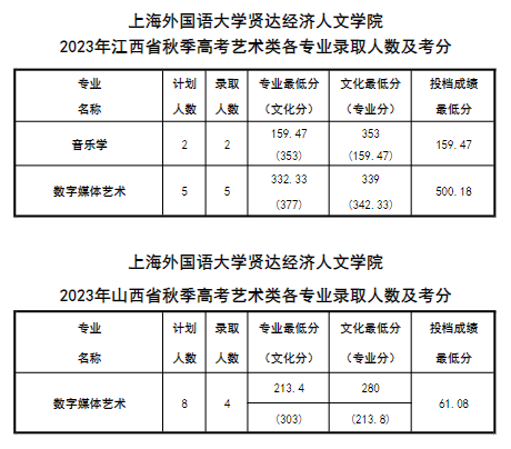 2023年上海外国语大学贤达经济人文学院艺术类录取分数线【全国】