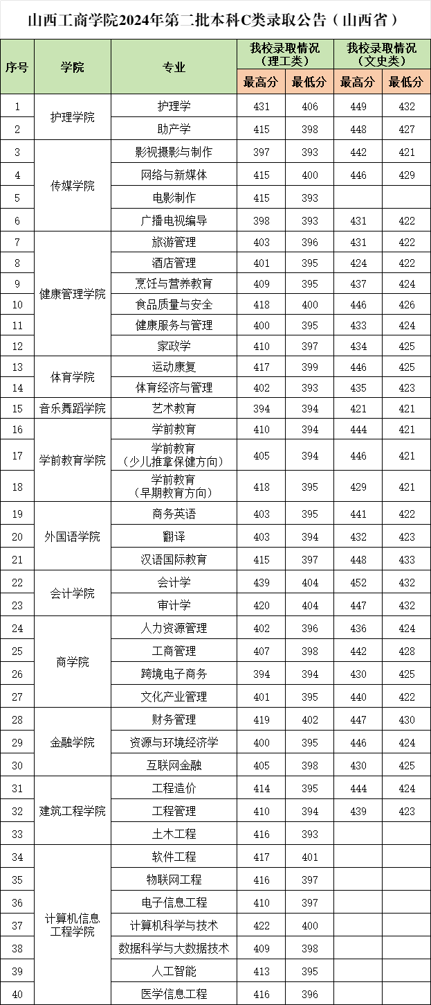 山西工商学院山西省2023年第二批本科C类录取情况(文史类、理工类)