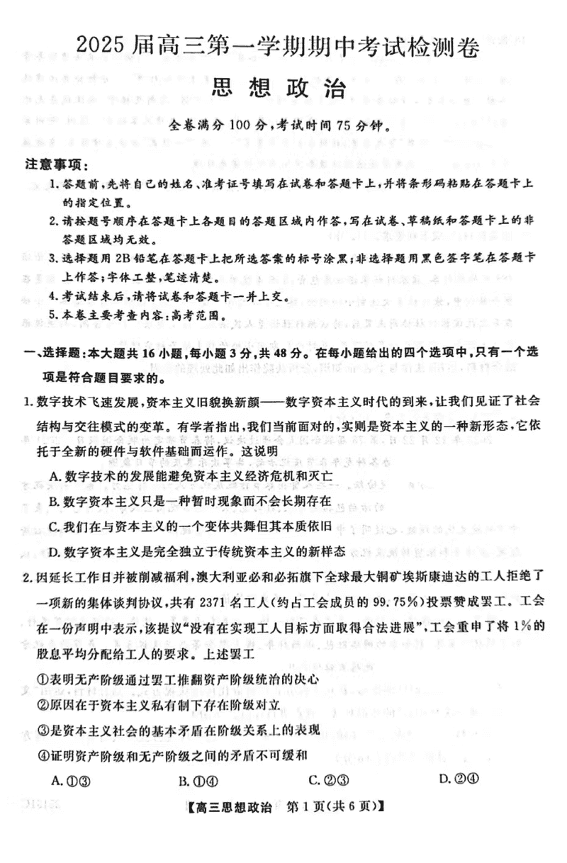 陕西十七校联考2025届高三上学期11月期中政治试卷及参考答案