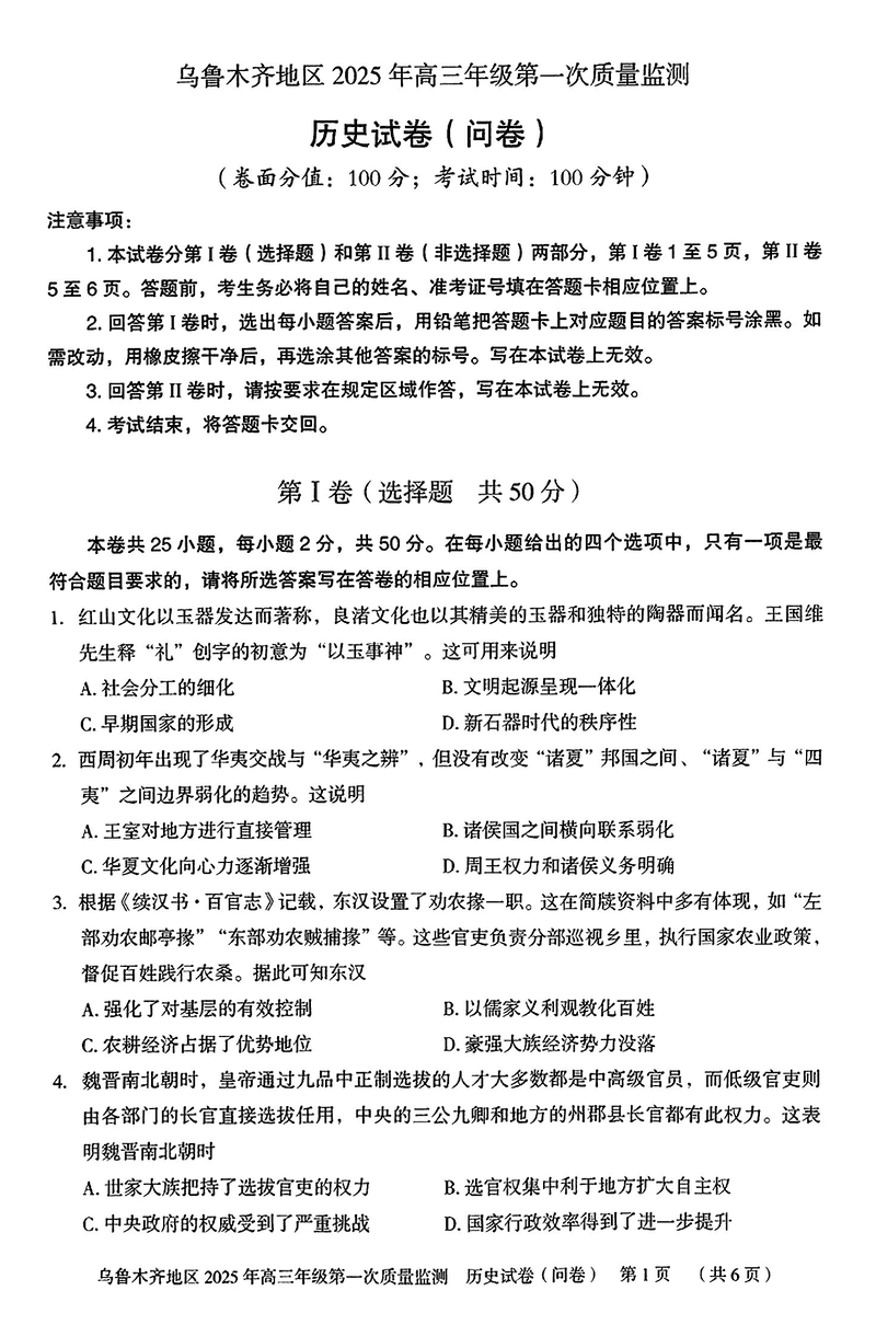 新疆乌鲁木齐2025年高三第一次质量监测历史试卷及参考答案